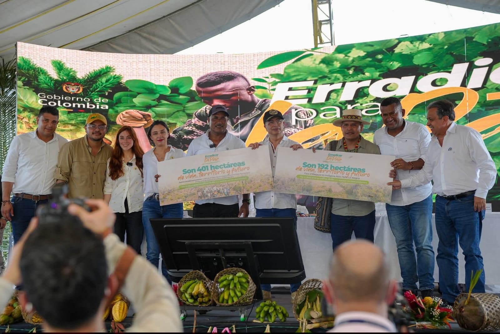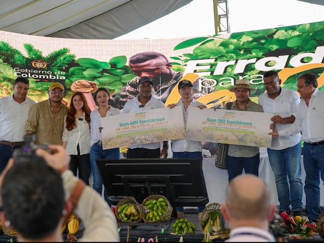 El presidente de la República, Gustavo Petro formalizó la entrega de 2.835 hectáreas de tierra a familias vinculadas al programa ‘Erradicar para la Paz’, cuyo objetivo principal es la sustitución voluntaria de cultivos de uso ilícito por la producción de alimentos, en la que participan las comunidades indígenas y afrodescendiente.