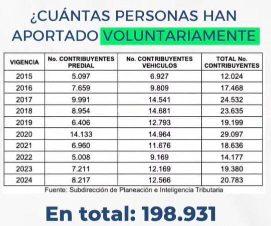 Así mismo, Uscátegui aclaró que los aportes voluntarios de los mismos impuestos (prediales y vehiculares) han sumado cerca de $10.000.000.000 de pesos en los últimos 10 años.