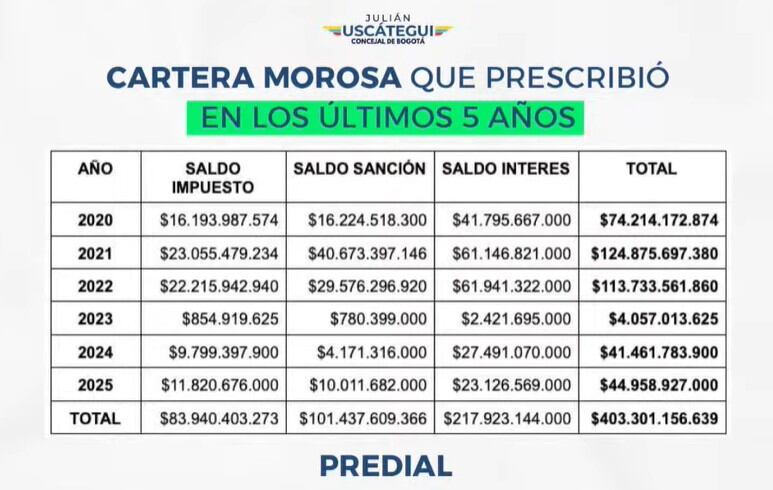 Uscátegui advirtió que, en los últimos cinco años, la ciudad dejó de recibir más de $403.301.156.639 pesos asociados al impuesto predial, así como $331.365.662.651 pesos referentes al impuesto vehicular, “cifras que representan montos significativos frente a sectores como seguridad, mujer y desarrollo económico”, explica el concejal. Al mismo tiempo propone evaluar medidas de alivio y amnistía tributaria para facilitar el pago de obligaciones en mora y normalizar la cartera distrital.