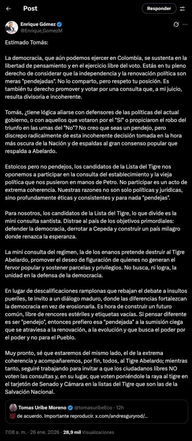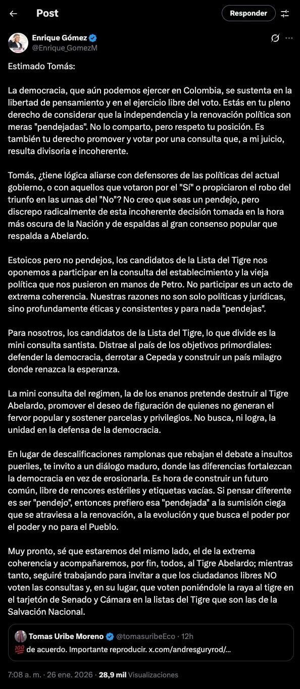 Ante estos señalamientos, el director de Salvación Nacional y candidato al Senado, Enrique Gómez, respondió con una carta pública dirigida a Tomás Uribe, en la que defendió la postura de su movimiento y rechazó el uso de descalificaciones personales en el debate político.
