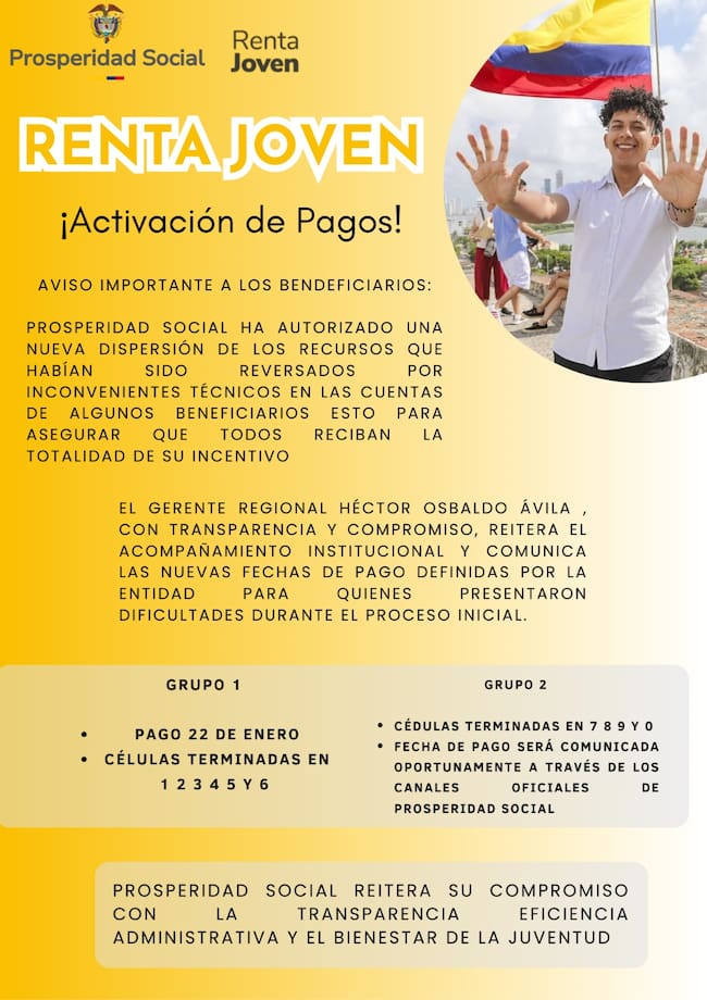 Ávila Rodríguez indicó que esta decisión responde al compromiso institucional de asegurar una entrega efectiva del apoyo económico. Por ello, se habilitaron fechas adicionales de pago para quienes tuvieron dificultades en el proceso inicial. En ese sentido, precisó que el Grupo 1, conformado por 6.687 participantes con cédulas terminadas en 1, 2, 3, 4, 5 y 6, recibirá la transferencia el 22 de enero de 2026. «...Nuestro objetivo es garantizar al 100 % que los jóvenes beneficiarios puedan retirar de manera efectiva la totalidad de su incentivo...», afirmó el gerente regional.