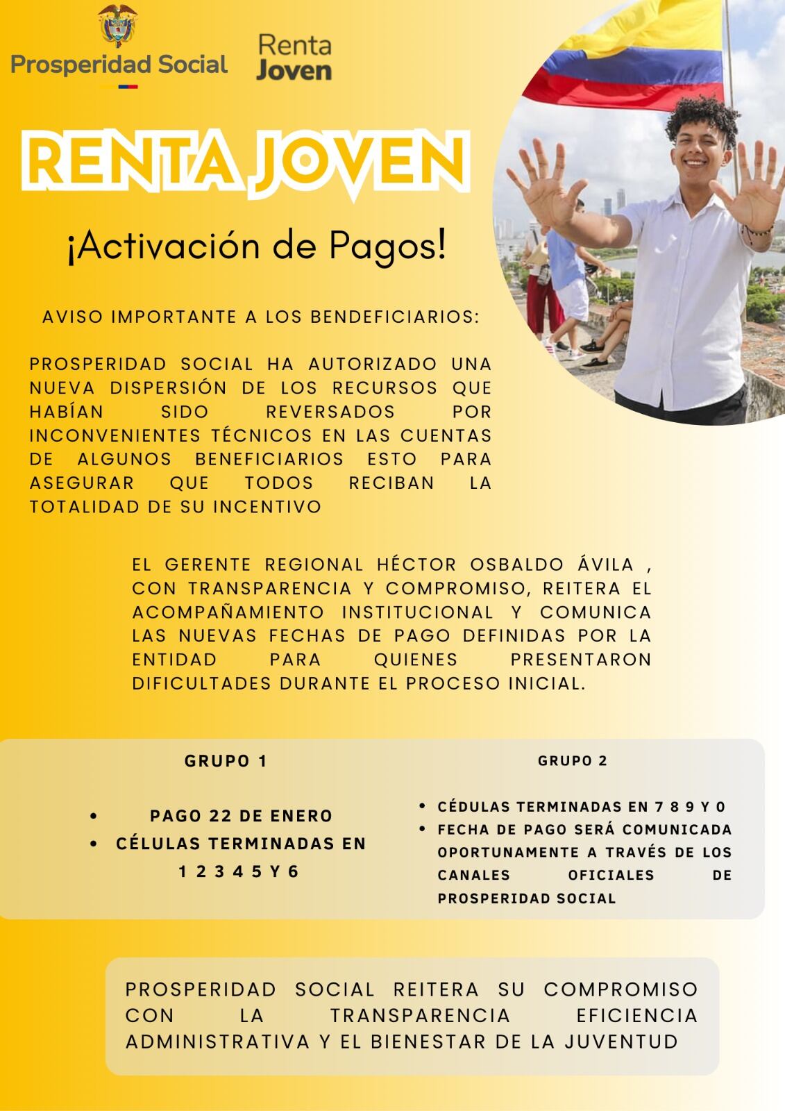 Ávila Rodríguez indicó que esta decisión responde al compromiso institucional de asegurar una entrega efectiva del apoyo económico. Por ello, se habilitaron fechas adicionales de pago para quienes tuvieron dificultades en el proceso inicial. En ese sentido, precisó que el Grupo 1, conformado por 6.687 participantes con cédulas terminadas en 1, 2, 3, 4, 5 y 6, recibirá la transferencia el 22 de enero de 2026. «...Nuestro objetivo es garantizar al 100 % que los jóvenes beneficiarios puedan retirar de manera efectiva la totalidad de su incentivo...», afirmó el gerente regional.