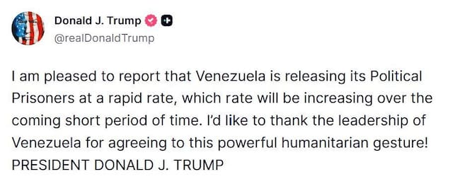 “Me complace informar que Venezuela está liberando a sus presos políticos a un ritmo acelerado, y se prevé que este ritmo aumente en las próximas semanas”, escribió Trump en su red social Truth Social, donde añadió que quiere “dar las gracias a los líderes de Venezuela por acceder a este importante gesto humanitario!
