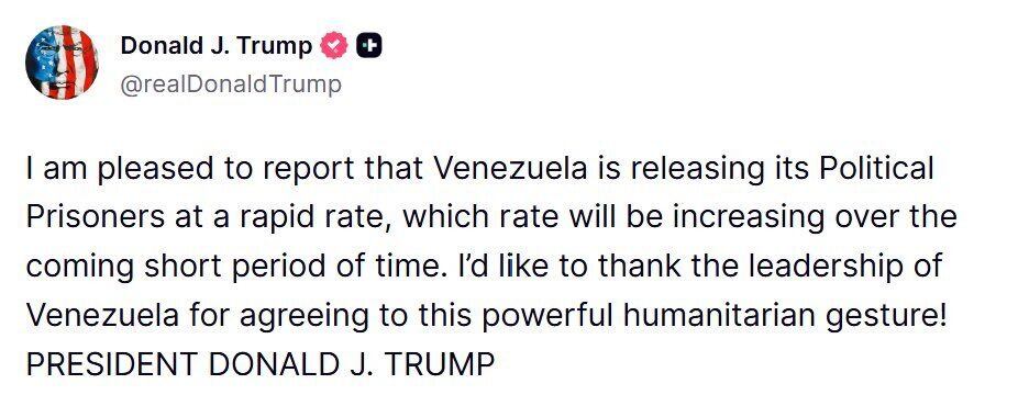 “Me complace informar que Venezuela está liberando a sus presos políticos a un ritmo acelerado, y se prevé que este ritmo aumente en las próximas semanas”, escribió Trump en su red social Truth Social, donde añadió que quiere “dar las gracias a los líderes de Venezuela por acceder a este importante gesto humanitario!