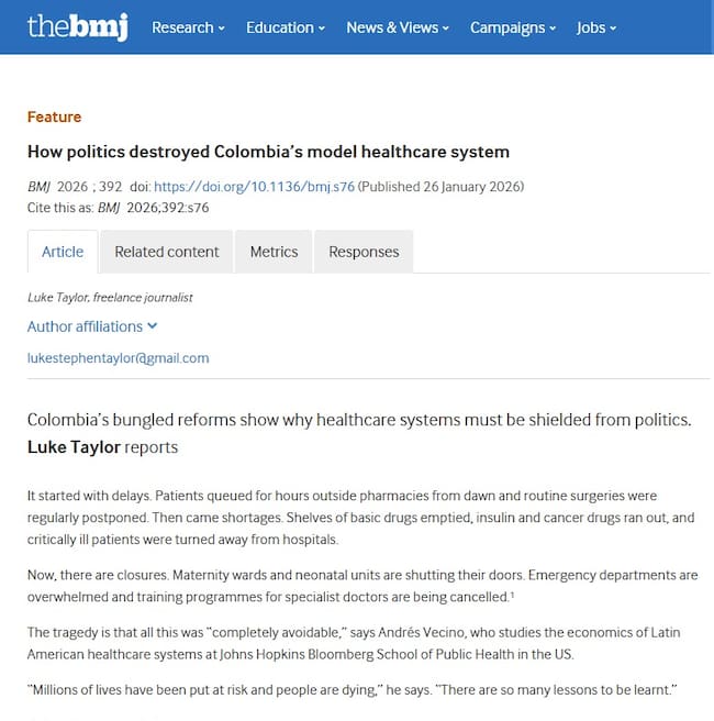 “La tragedia (del sistema de salud) era completamente evitable”, señala en uno de sus párrafos introductorios el informe que publica este martes, 27 de enero, uno de los medios más serios e influyentes a nivel global en asuntos médicos y que responsabiliza directamente al Gobierno de Gustavo Petro por la situación crítica por la que hoy atraviesa el que, según el British Medical Journal, era hasta antes de Petro “un ejemplo que debía imitar toda Latinoamérica”.