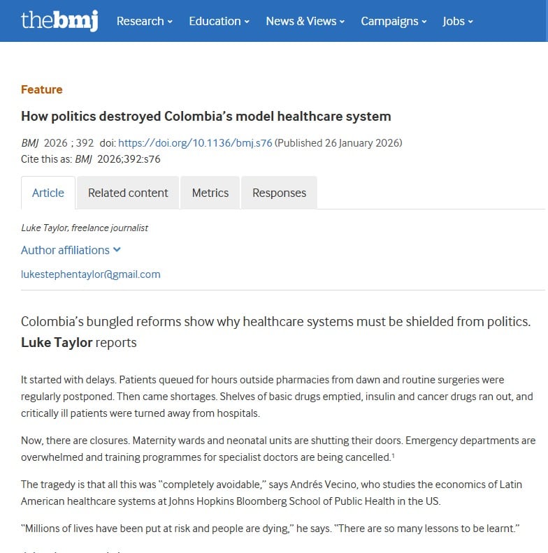 British Medical Journal responsabiliza al gobierno Petro de destrucción del sistema de salud colombiano