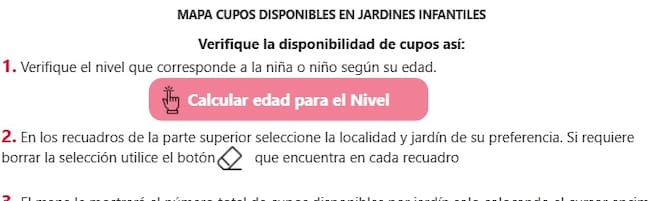 - Una vez ingrese al mapa interactivo, aparecerá la lista completa de las unidades operativas junto con la disponibilidad de cupos de acuerdo con el nivel/edad del niño.
