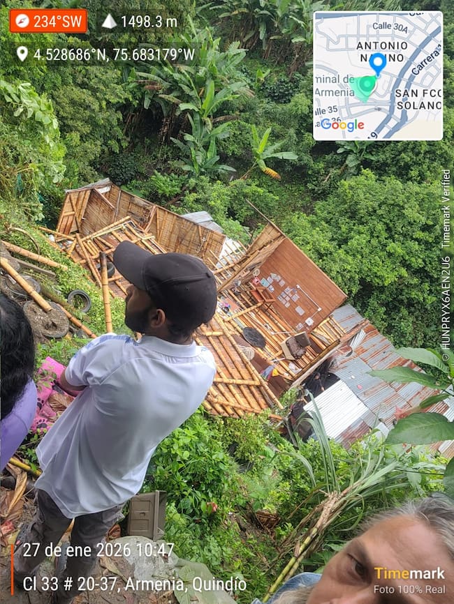 El funcionario agregó “De igual manera a las 7:50 a.m. en el barrio Gaitan Alto, al sur de Armenia, sector ubicado detrás de la cancha se presentó un colapso total de una vivienda afectando a dos adultos y tres menores, los cuales lamentablemente perdieron absolutamente todos sus enseres, quedando en una situación de alta vulnerabilidad.