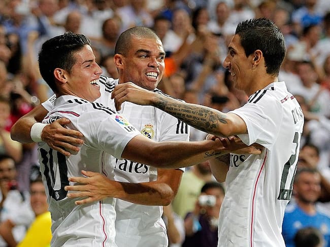 James Rodríguez, Pepe y Ángel Di María celebran en un partido del Real Madrid contra el Atlético de Madrid / Getty Images / Angel Martinez - Real Madrid