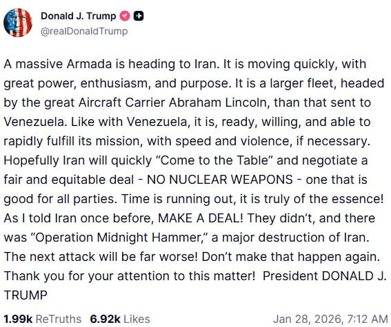 “Esperamos que Irán se siente pronto en la mesa para negociar un acuerdo justo y equitativo para todas las partes- NO ARMAS NUCLEARES- “, escribió el mandatario en su plataforma Truth Social, al destacar que un importante contingente de la Marina estadounidense se dirige hacia ese país, inclusive mayor al que envió a Venezuela.