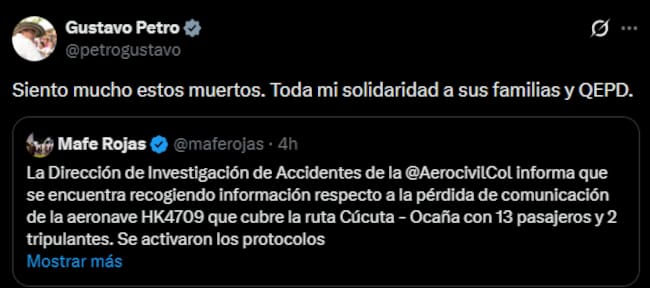 - Gustavo Petro, presidente: "Siento mucho estos muertos. Toda mi solidaridad a sus familias y QEPD".