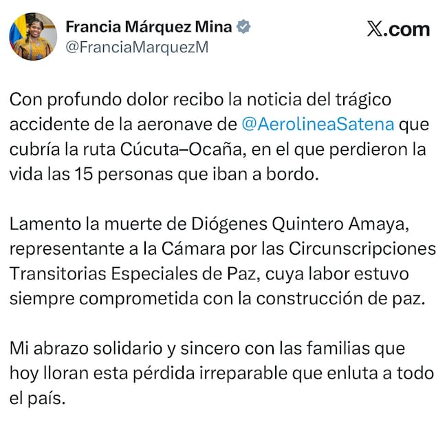 - Francia Márquez, vicepresidenta: “Con profundo dolor recibo la noticia del trágico accidente de la aeronave de Satena que cubría la ruta Cúcuta–Ocaña, en el que perdieron la vida las 15 personas que iban a bordo".