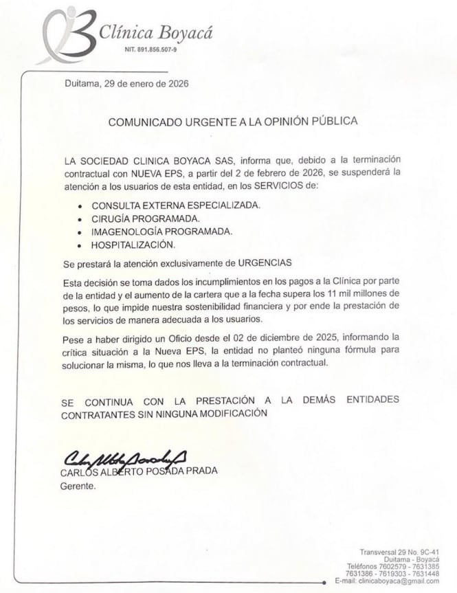 La Clínica Boyacá S.A.S., con sede en Duitama, informó que a partir del 2 de febrero de 2026 suspenderá la atención a los usuarios afiliados a Nueva EPS en varios servicios de salud, debido a la terminación del contrato con esa entidad promotora. Según el comunicado emitido por la institución, la medida afectará la consulta externa especializada, la cirugía programada, los servicios de imagenología programada y la hospitalización, mientras que la atención de urgencias se mantendrá de manera exclusiva para estos usuarios.