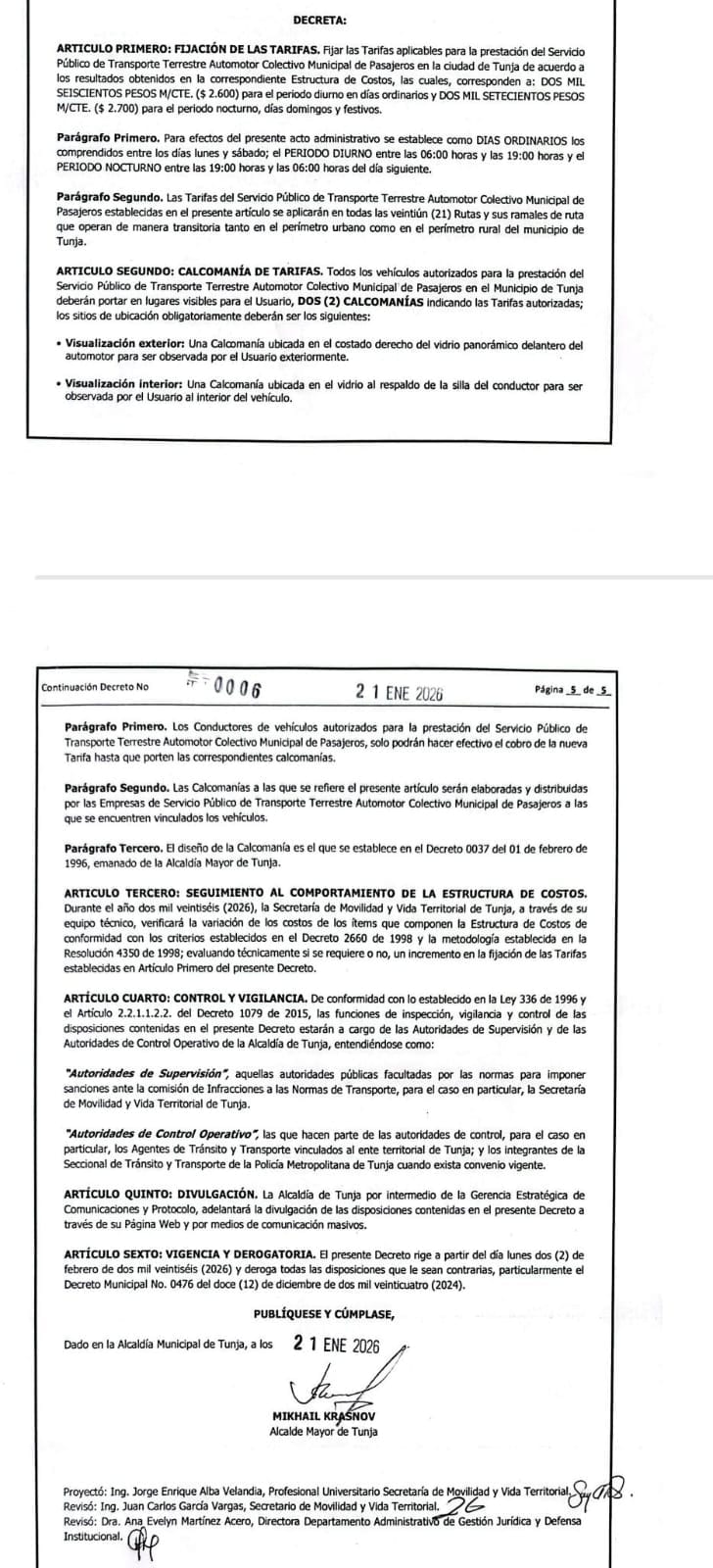 Decreto 0006 del 21 de enero de 2026 el cual fija el alza en $200 la tarifa del pasaje de servicio público colectivo en Tunja.