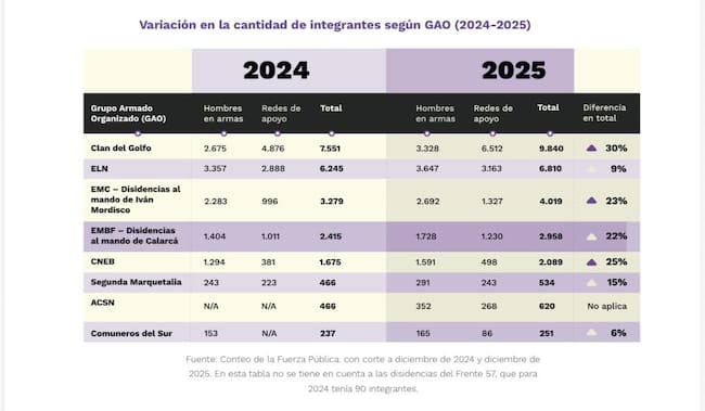 En total, el número de integrantes aumentó un 23.5% con respecto al 2024, llegando a un total de 27.121 personas, de los cuales 13.794 son hombres con armas y 13.327 están en redes de apoyo; esto representa un aumento de 5.000 más en un año.