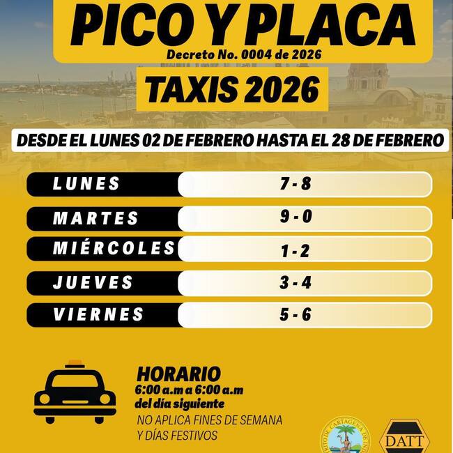 La Alcaldía Mayor de Cartagena, a través del Departamento Administrativo de Tránsito y Transporte (DATT), informa a la ciudadanía y al gremio de taxistas que, mediante el Decreto 0004 de 2026, se establece la nueva rotación del pico y placa para el servicio público individual tipo taxi, la cual regirá del 02 al 27 de febrero de 2026.