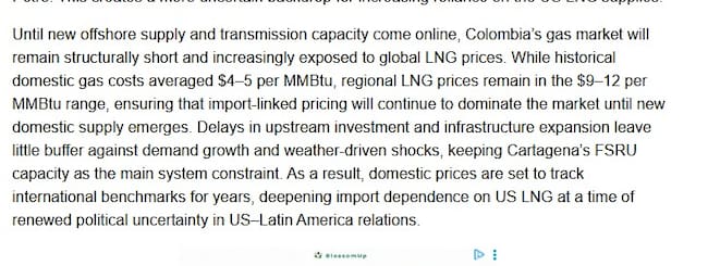 Este punto se convierte en un elemento de máxima alerta por parte de la analista, quien señala que Trinidad y Tobago está poco a poco reduciendo sus ventas de gas, lo cual significa que Colombia quedaría expuesta a compra de gas esencialmente a los EEUU, un escenario demasiado tenso para el país teniendo en cuenta la difìcil relación de Gustavo Petro con Donald Trump.