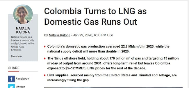 “Colombia depende ahora del Gas Natural Licuado. Se agotan sus reservas”, es el titular del análisis firmado por Natalia Katona, periodista experta en comodities, en el que señala que a pesar de la inmensa esperanza que representa el proyecto costa afuera Sirius, este no permitirá que Colombia recupere su capacidad gasífera, sino hasta después del año 2031 por lo que el país terminará dependiendo del gas que se compre a Estados Unidos o Trinidad y Tobago.