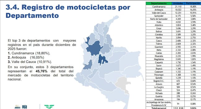 El departamento no figura entre los 3 departamentos donde más se compraron y se registraron motocicletas a lo largo del año pasado. “Cundinamarca, Antioquia y Valle del Cauca encabezaron los registros del mes de diciembre, con municipios como Sabaneta, Funza y El Cerrito; territorios donde la motocicleta cumple un rol clave en la movilidad local y actividades productivas”.