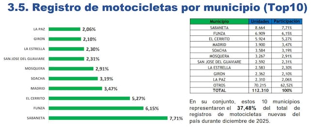 Sin embargo, este municipio del área metropolitana de Bucaramanga sigue en el top 10 de las poblaciones de Colombia con más registros de motocicletas nuevas durante diciembre de 2025.