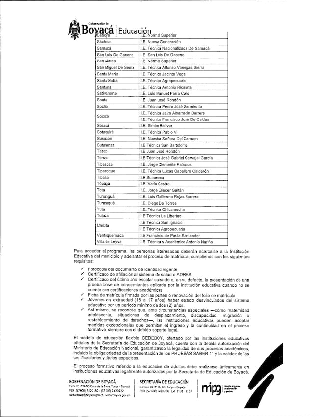 En este contexto, la Secretaría de Educación de Boyacá recordó que el departamento tiene garantizada la educación gratuita y legal para jóvenes y adultos. A través de la Circular 016 del 28 de enero de 2026, se dio a conocer el proceso de matrícula al Programa para Adultos y Jóvenes en Extraedad, bajo el modelo de educación flexibleCEDEBOY, ofertado por instituciones educativas oficiales y autorizado por el Ministerio de Educación Nacional.