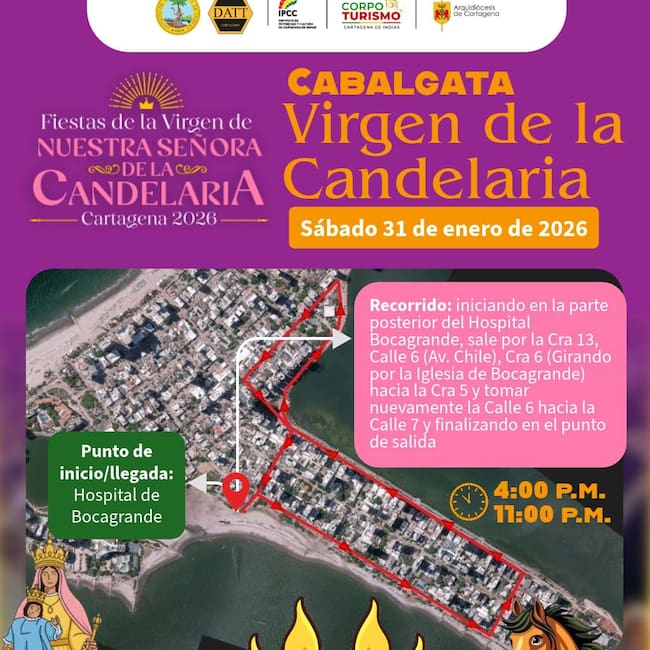 La Alcaldía Mayor de Cartagena, a través del Departamento Administrativo de Tránsito y Transporte – DATT, informa a la comunidad de Bocagrande y la ciudadanía en general la realización de la Cabalgata a la Virgen de la Candelaria 2026, un evento que reunirá a fieles, participantes y espectadores en un recorrido lleno de significado cultural y religioso.