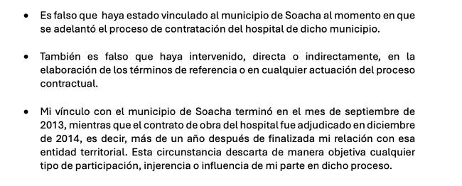 En un pronunciamiento del 1 de febrero de 2026, Ramírez Rusinque aseguró que no estuvo vinculado al municipio de Soacha al momento en que se adelantó la licitación y que no participó, directa ni indirectamente, en la elaboración de los pliegos de condiciones. Según indicó, su relación con esa administración terminó en septiembre de 2013, mientras que el contrato del hospital fue adjudicado en diciembre de 2014, más de un año después.