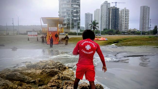 Ante estas condiciones, las autoridades marítimas han declarado bandera roja en las playas de Cartagena, por lo que está prohibido el ingreso al mar debido al alto riesgo generado por corrientes fuertes y oleaje elevado.