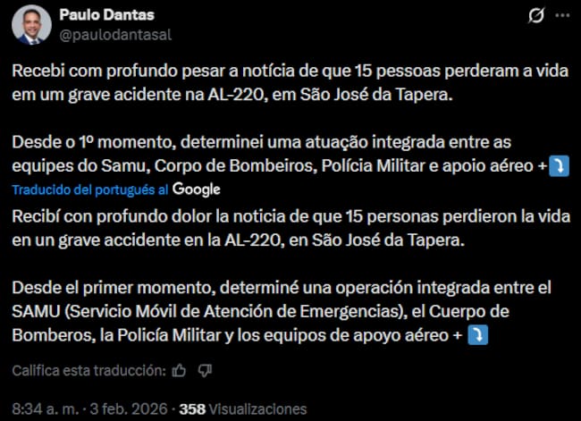 El gobernador del estado de Alagoas, Paulo Dantas, decretó un duelo oficial de tres días por la tragedia.