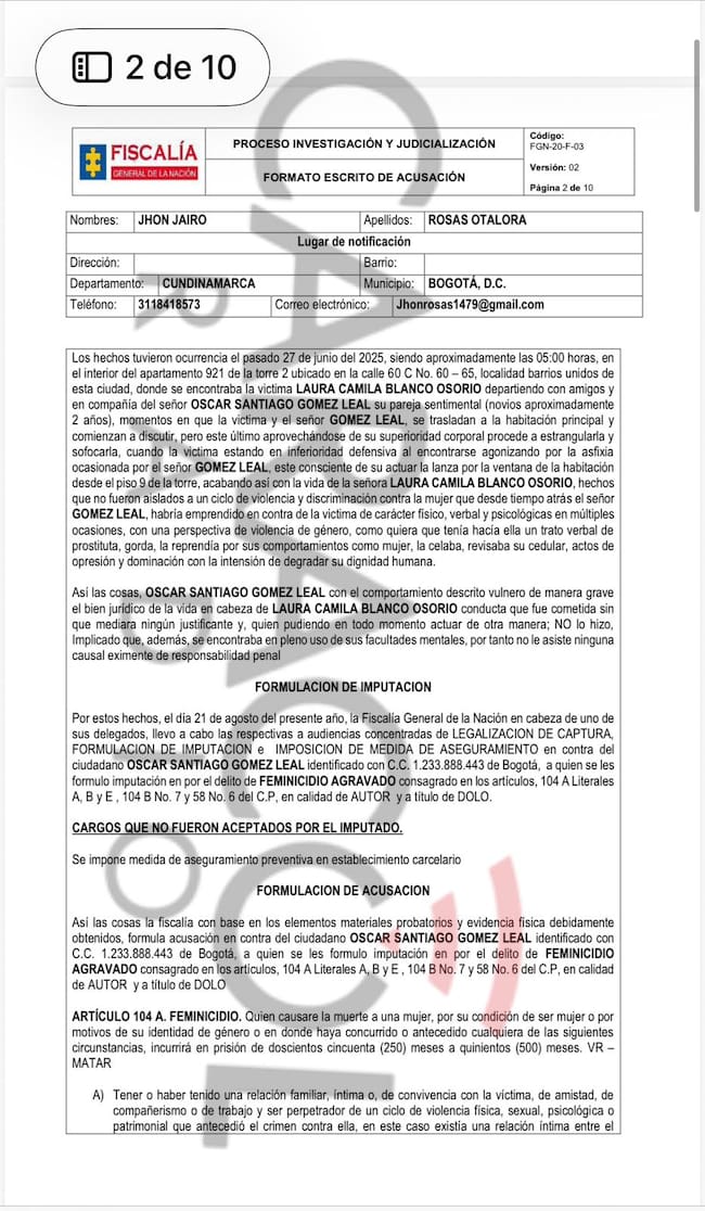 Caracol Radio conoció en primicia el escrito de acusación de 10 páginas con el que la Fiscalía General de la Nación llamó a juicio a Óscar Santiago Gómez Leal, quien, al parecer, habría asesinado a su novia, Laura Camila Blanco Osorio, en hechos ocurridos sobre las 5:00 de la mañana del domingo 27 de julio de 2025.