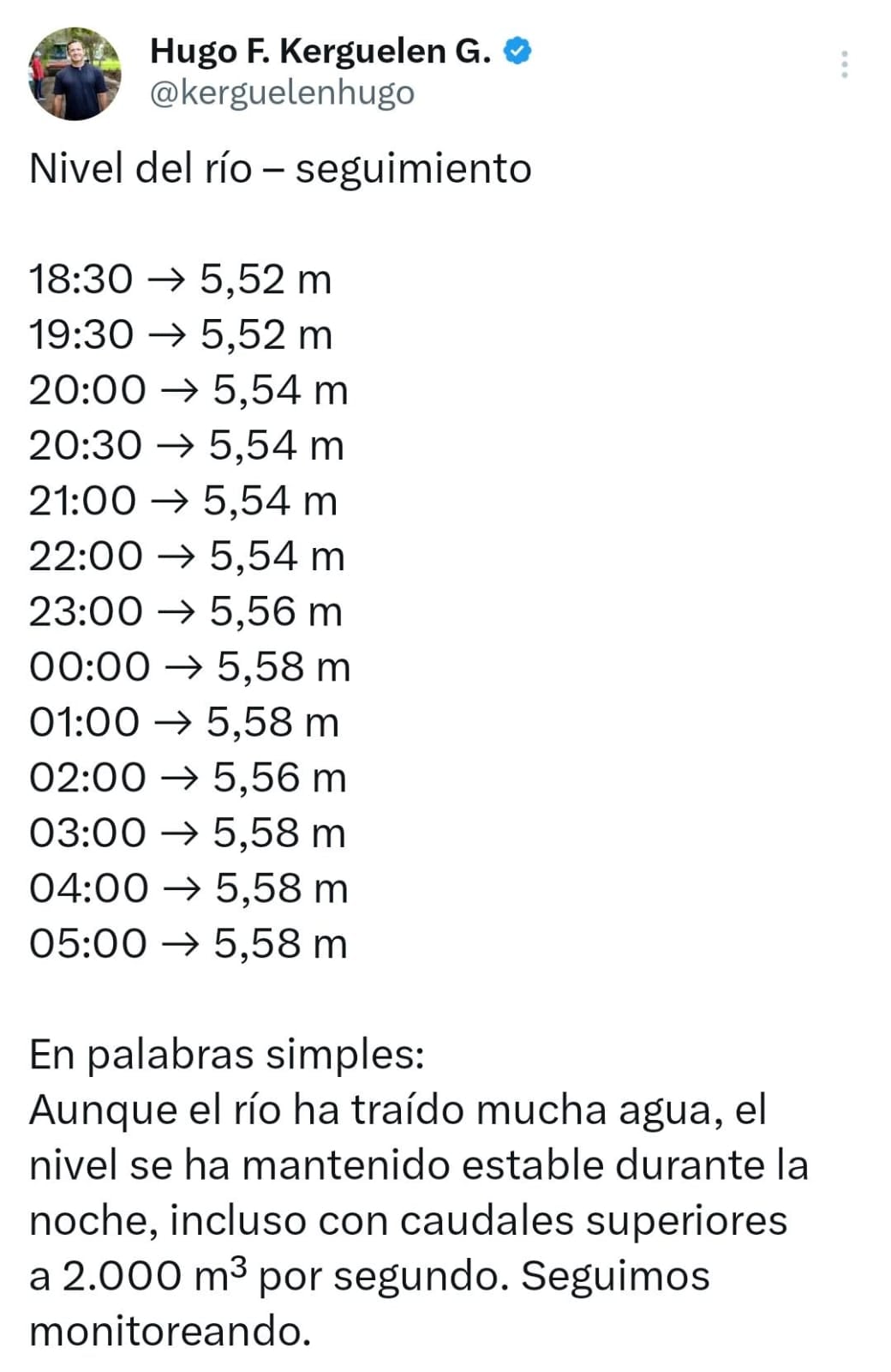 “Aunque el río ha traído mucha agua, el nivel se ha mantenido estable durante la noche (3 de febrero), incluso con caudales superiores a los 2.000 metros cúbicos por segundo. Seguimos monitoreando”, expresó el mandatario municipal.