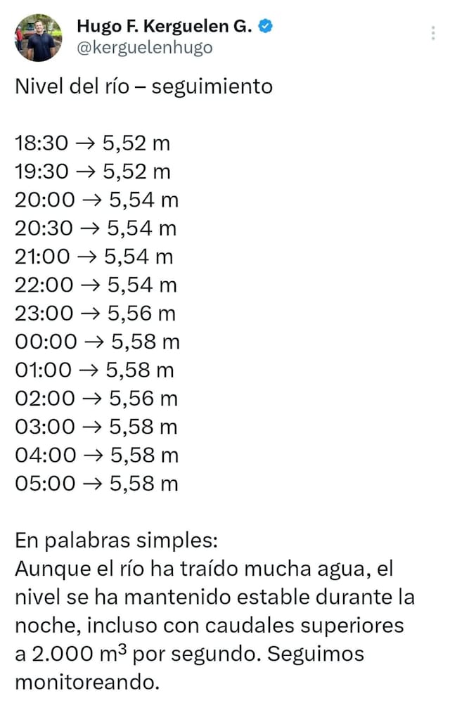 El alcalde de la capital de Córdoba, Hugo Kerguelén, dijo que los niveles del río se mantienen estables, pese al panorama en la Avenida Primera y otros sectores urbanos.