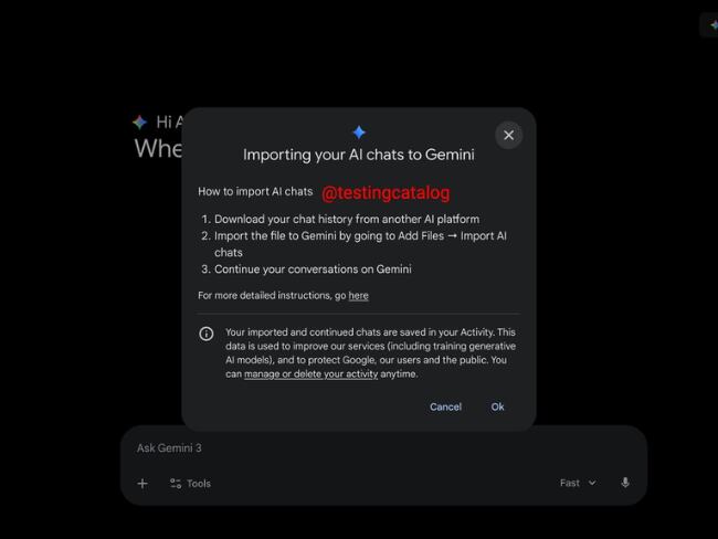 Función en pruebas beta para importar chats a Gemini. Crédito: testingcatalog.com