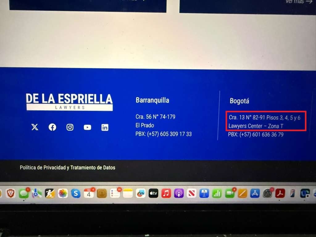 La dirección que la nueva firma de abogados registra en su página web es Carrera 13 # 82-91. La misma dirección de De la Espriella Lawyers en Bogotá.