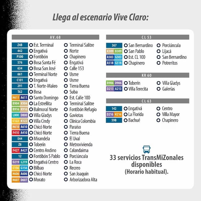 De acuerdo con la información publicada por Transmilenio, la flota de buses enfocados en el concierto priorizará las estaciones de Salitre El Greco y CAN - British Council, puesto que son las estaciones más cercanas al venue Vive Claro.