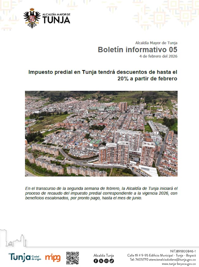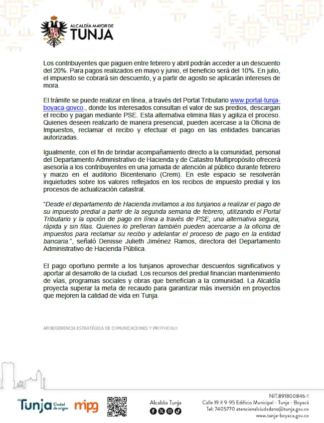 La directora del Departamento Administrativo de Hacienda Pública, Denisse Julieth Jiménez Ramos, invitó a los tunjanos a aprovechar los beneficios. «...Desde el departamento de Hacienda invitamos a los tunjanos a realizar el pago de su impuesto predial a partir de la segunda semana de febrero, utilizando el Portal Tributario y la opción de pago en línea a través de PSE, una alternativa segura, rápida y sin filas...», señaló. La funcionaria destacó que el recaudo oportuno permite financiar mantenimiento de vías, programas sociales y obras públicas, y que la Alcaldía espera superar la meta de recaudo para garantizar mayor inversión en proyectos que mejoren la calidad de vida en Tunja.
