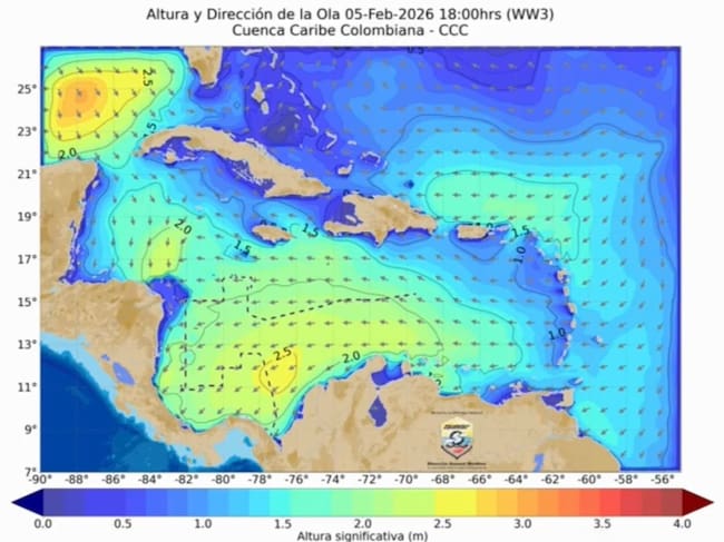 En el mar Caribe se registra el tránsito de un frente frío que desciende desde el Golfo de México hacia el noroeste del mar Caribe. Este sistema propiciará el desarrollo de precipitaciones intermitentes en áreas aledañas al Archipiélago de San Andrés, Providencia y Santa Catalina, así como en las Islas Cayos del Norte, entre los días 6 y 8 de febrero de 2026. Durante este periodo se prevén vientos del norte–noreste con velocidades entre 31 y 37 km/h, y alturas significativas de ola que oscilarán entre 2.5 y 3.1 metros.