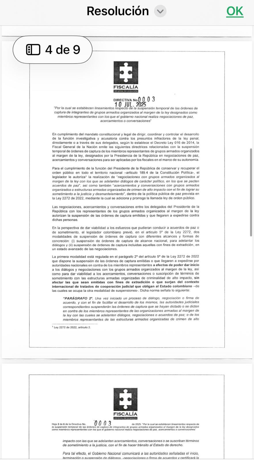 “En otros términos, la petición que se formula no consulta lo establecido en la Ley 2272 de 2022, que ordenó que la suspensión de esas órdenes de captura durante el desplazamiento y dentro de las zonas de ubicación temporal opere por mandato de la propia ley y no por disposición de la Fiscalía General de la Nación”, se lee en el documento.