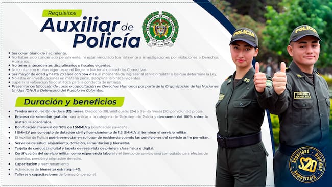 “Los aspirantes recibirán muchos beneficios, en servicios de salud, alojamiento, dotación, alimentación. Por otro lado, el Auxiliar de Policía podrá pernoctar en su lugar de residencia cuando las condiciones del servicio así lo permitan, también recibirán Talleres y capacitaciones de formación personal”, indicó.