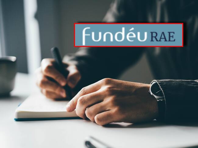 Persona escribiendo, imagen de referencia. En el recuadro, el logo de Fundéu. Fotos: Getty Images y Fundéu.