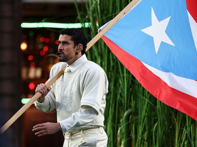 SANTA CLARA, CALIFORNIA - FEBRUARY 8: Bad Bunny performs in the Apple Music Halftime Show during the NFL Super Bowl 60 football game between the Seattle Seahawks and the New England Patriots, at Levi's Stadium on February 8, 2026 in Santa Clara, California. (Photo by Kevin Sabitus/Getty Images) / Kevin Sabitus
