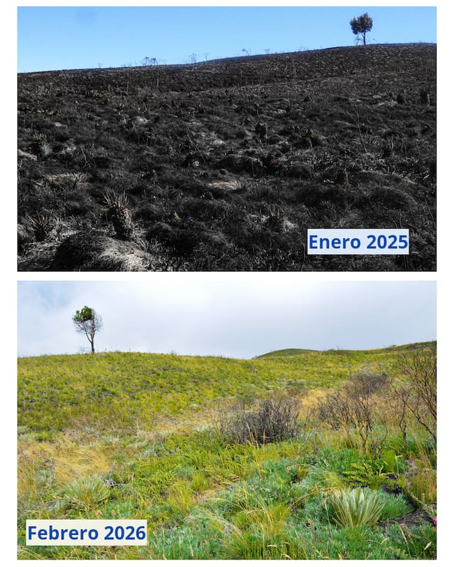 “Fue realmente maravilloso llegar al páramo y encontrarlo reverdeciendo. Hace un año todo eran cenizas y hoy vemos una gran variedad de plantas creciendo de manera natural”, señaló. De acuerdo con el fotógrafo, actualmente se observan frailejones recuperándose, pajonales que vuelven a poblar el territorio, así como musgos, insectos y polinizadores que cumplen un papel clave en la restauración del ecosistema.