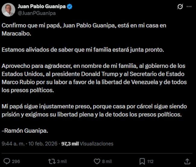 El dirigente opositor venezolano Juan Pablo Guanipa se encuentra en su residencia en la ciudad de Maracaibo, capital del estado Zulia (noroeste), donde cumplirá arresto domiciliario tras ser detenido el domingo, horas después de su excarcelación, informó este martes su hijo, Ramón Guanipa.