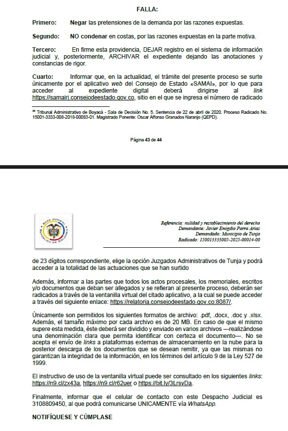 El fallo también dispuso no condenar en costas, al no evidenciarse que estas se hubieran causado durante el proceso, y ordenó archivar el expediente una vez la decisión quede en firme. El trámite judicial se continuará gestionando a través del sistema digital SAMAI del Consejo de Estado, donde las partes podrán consultar las actuaciones del proceso identificado con el radicado 15001-3333-005-2025-00014-00.
