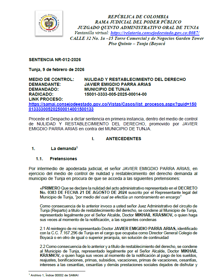 El Juzgado Quinto Administrativo del Circuito Judicial de Tunja negó las pretensiones de la demanda interpuesta por Javier Emigdio Parra Arias contra el Municipio de Tunja, dentro de un proceso de nulidad y restablecimiento del derecho, según la sentencia de primera instancia emitida el 9 de febrero de 2026. El demandante buscaba que se anulara el acto administrativo mediante el cual se declaró la insubsistencia tácita de su nombramiento en un cargo de libre nombramiento y remoción.