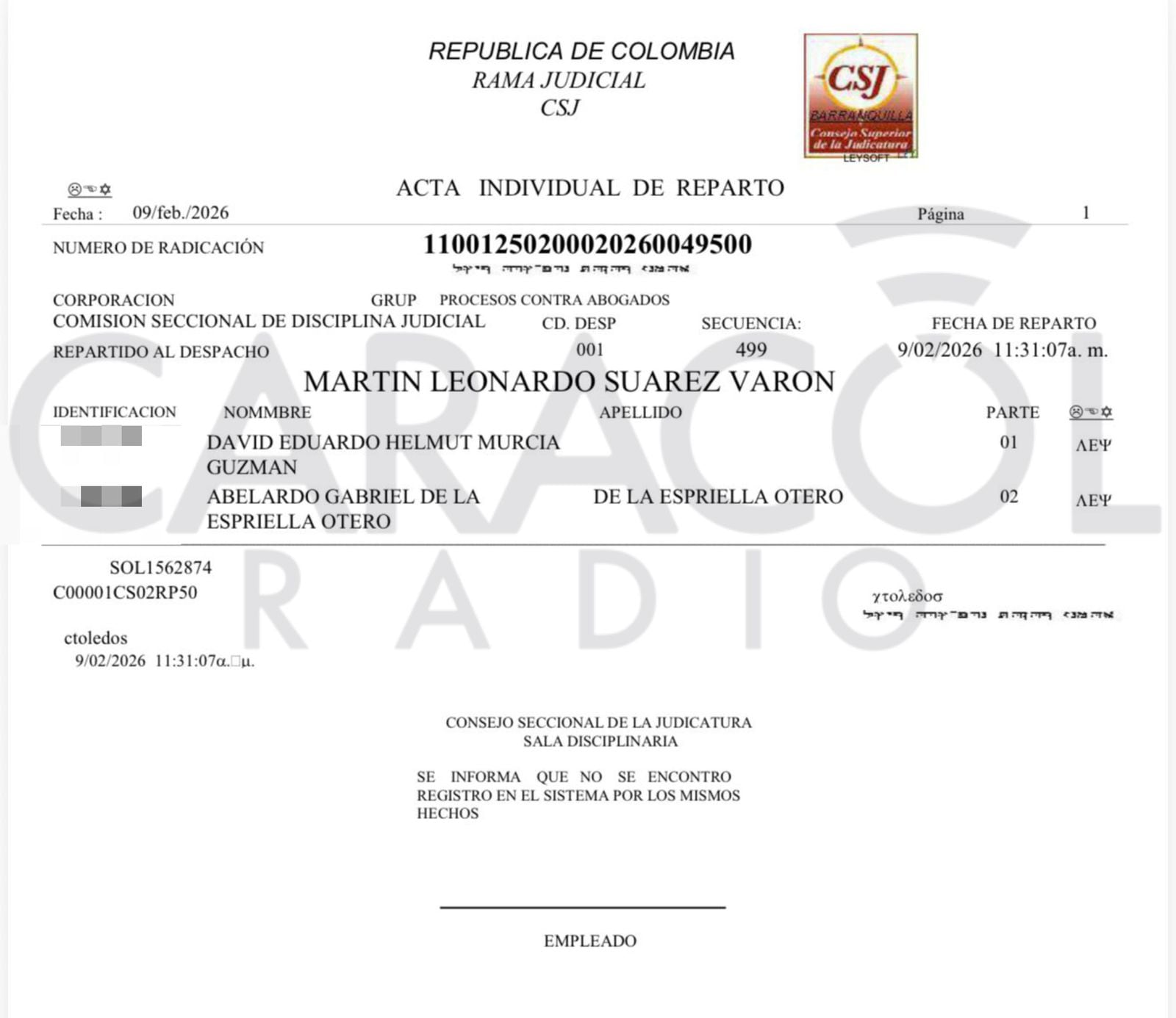 La queja disciplinaria ya fue presentada en la Comisión Seccional de Disciplina Judicial de Bogotá y por reparto le correspondió al magistrado Martín Leonardo Suárez Varón.