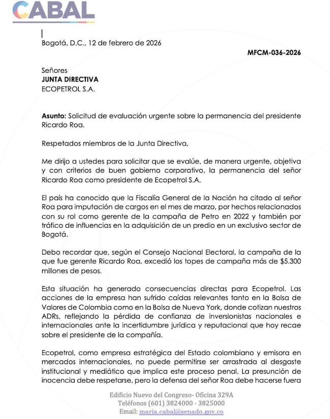 La senadora del Centro Democrático, María Fernanda Cabal, le solicitó de manera oficial a la Junta Directiva de Ecopetrol evaluar, “de manera urgente y objetiva”, la permanencia de Ricardo Roa en la presidencia de la estatal.