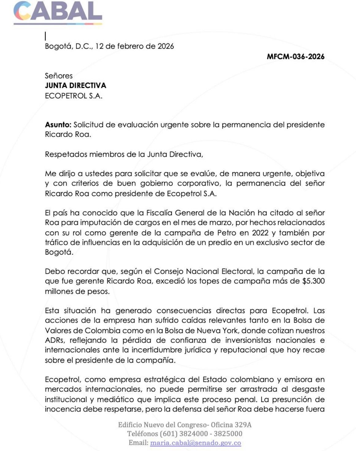 La senadora del Centro Democrático, María Fernanda Cabal, le solicitó de manera oficial a la Junta Directiva de Ecopetrol evaluar, “de manera urgente y objetiva”, la permanencia de Ricardo Roa en la presidencia de la estatal.