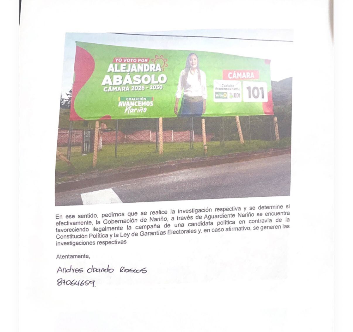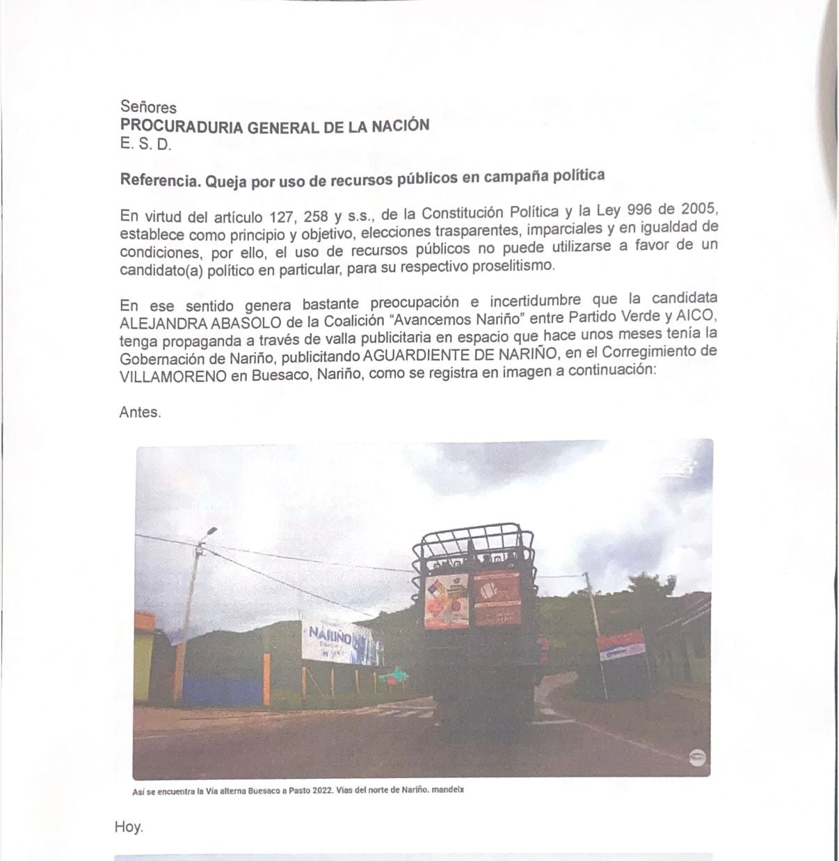 El hecho registrado con el funcionario no es el único que se ha presentado en la región en desarrollo de la contienda electoral. En manos de la Procuraduría General de la Nación está una investigación a la firma Aguardiente Nariño, por un millonario contrato de vallas publicitarias, algunas de las cuales supuestamente en lugar de promocionar el producto, habrían sido utilizadas por una candidata a la Cámara de Representantes Alejandra Abásolo quien en meses anteriores fungió como asesora de la Gobernación de Nariño.