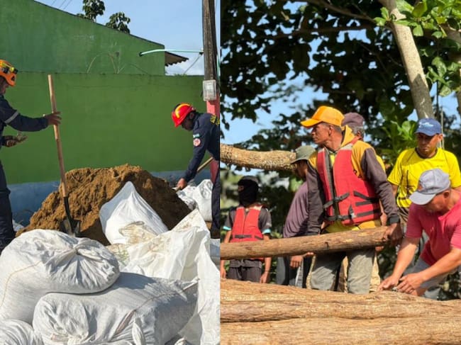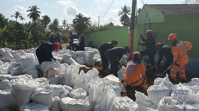 En los puntos críticos, el trabajo no se detiene. Desde temprano cargan bultos, llenan sacos de arena y apoyan la construcción de diques improvisados para intentar frenar el agua. “Desde las 7 de la mañana estamos acá. Ayer estuvimos trabajando en la construcción del dique en San Pelayo”, relata otro de los rescatistas que lleva varios días en terreno.